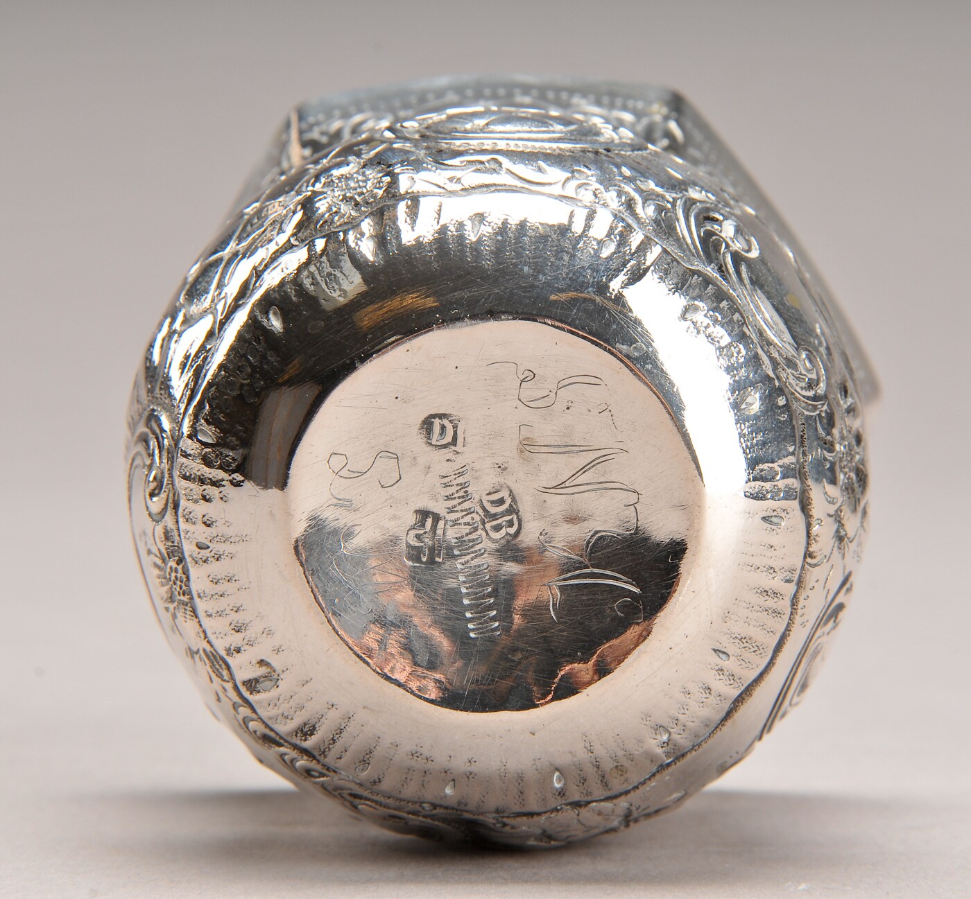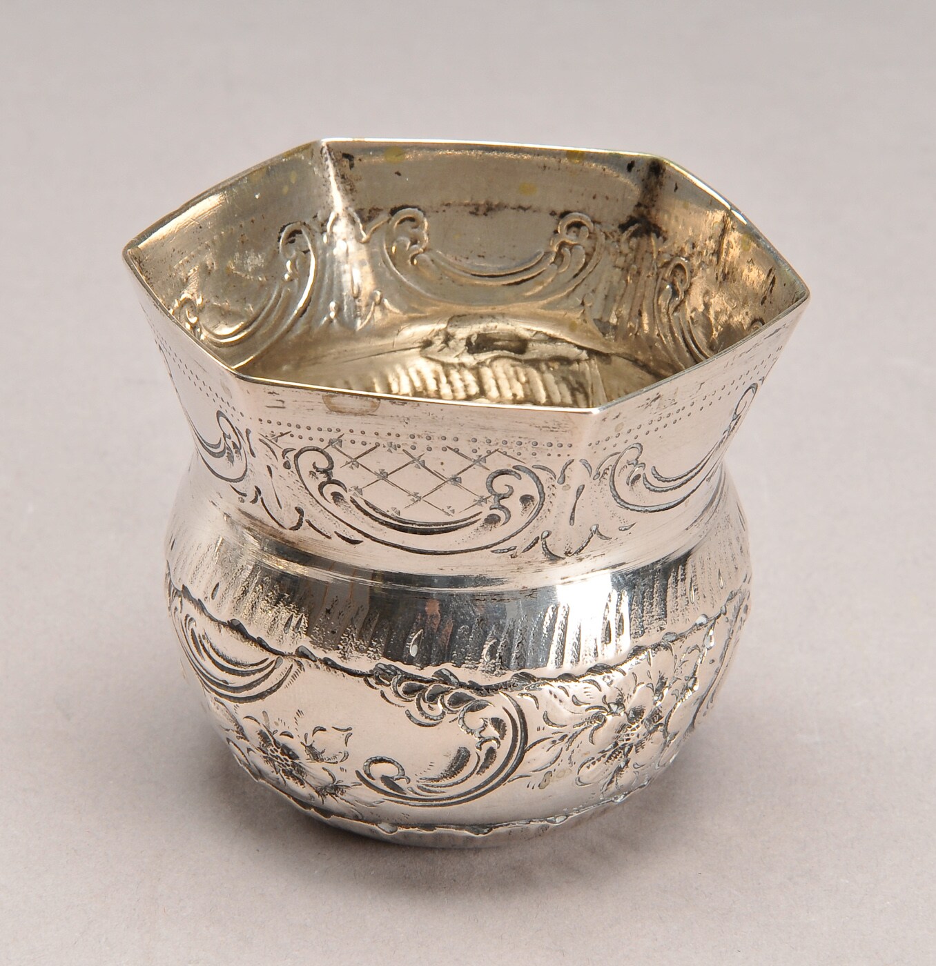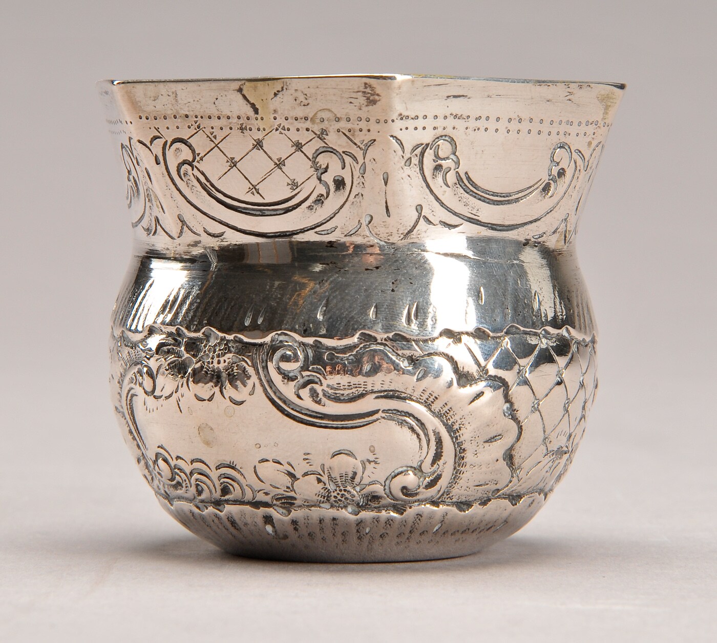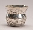Tumling i barokstil af sølv med rococoornamentik, ca. 1900. H. 5,7 cm. Ejerinitialer ibund. Vægt 50 g.